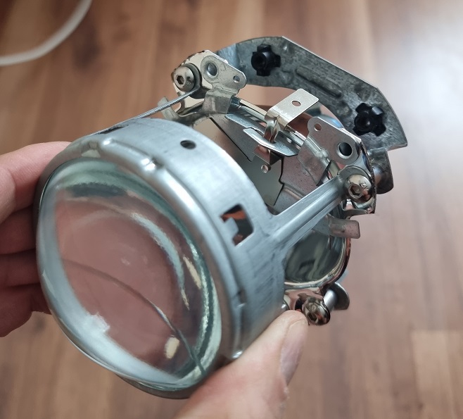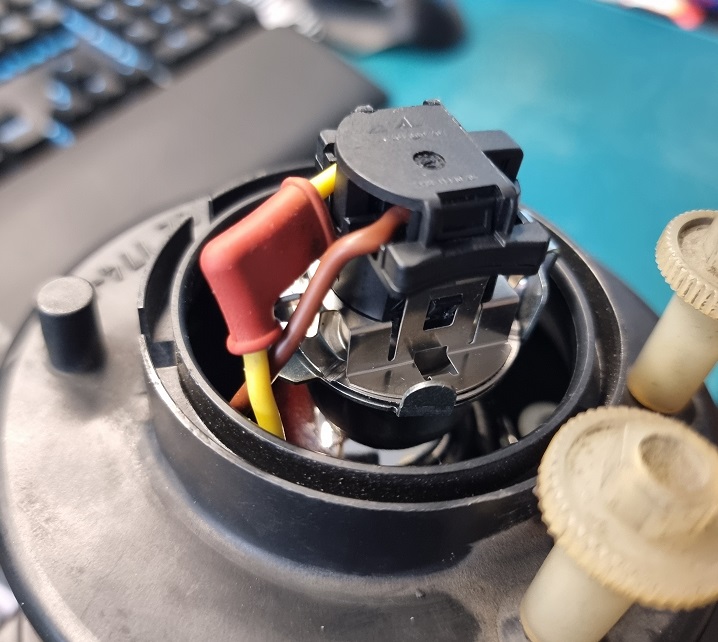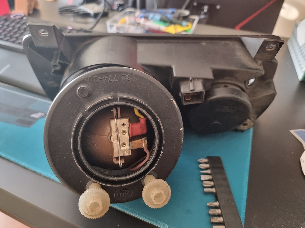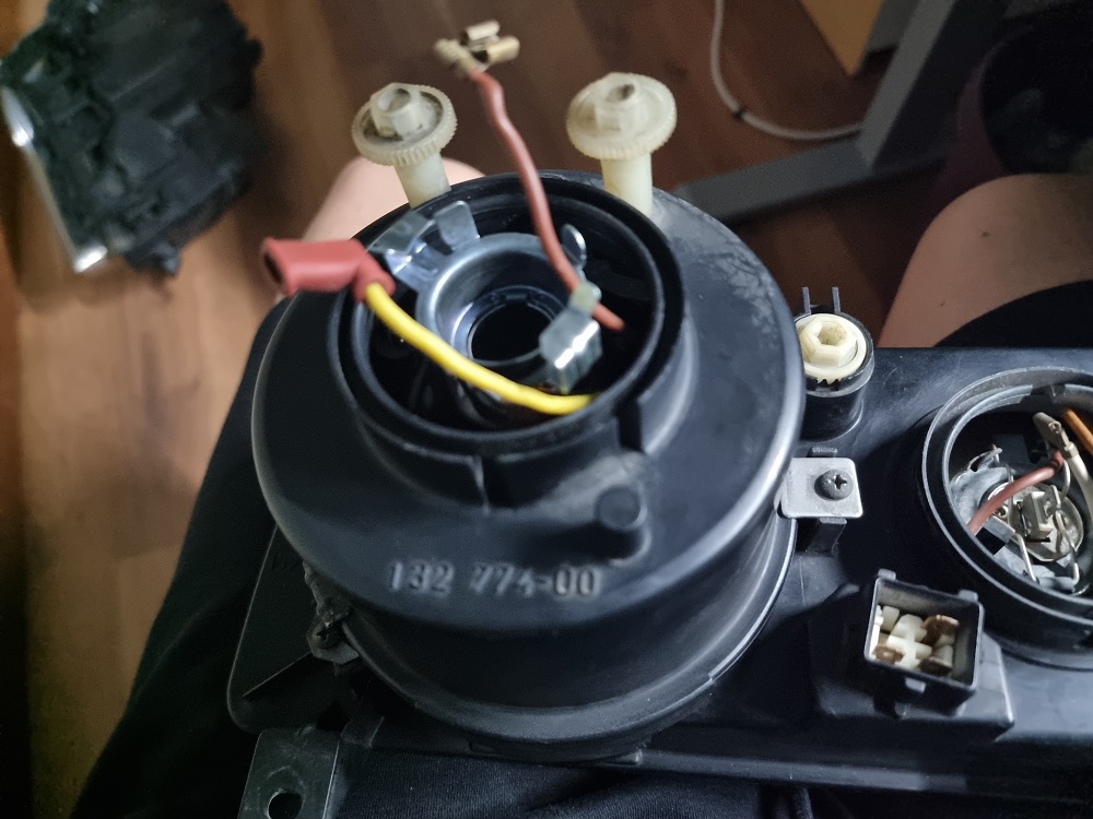 Nun das Strahlergehäuse wieder mit den Winkeln und Schrauben das Scheinwerfergehäuse montieren. Danach die 2 Kabel für die ehemalige H2 Birne seitlich durchfedeln bzw. bis nach hinten raus führen. Hier nun ein fertiges Bild vom Einbau und Verkabeln: