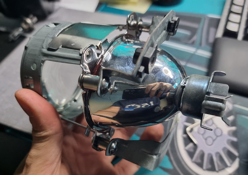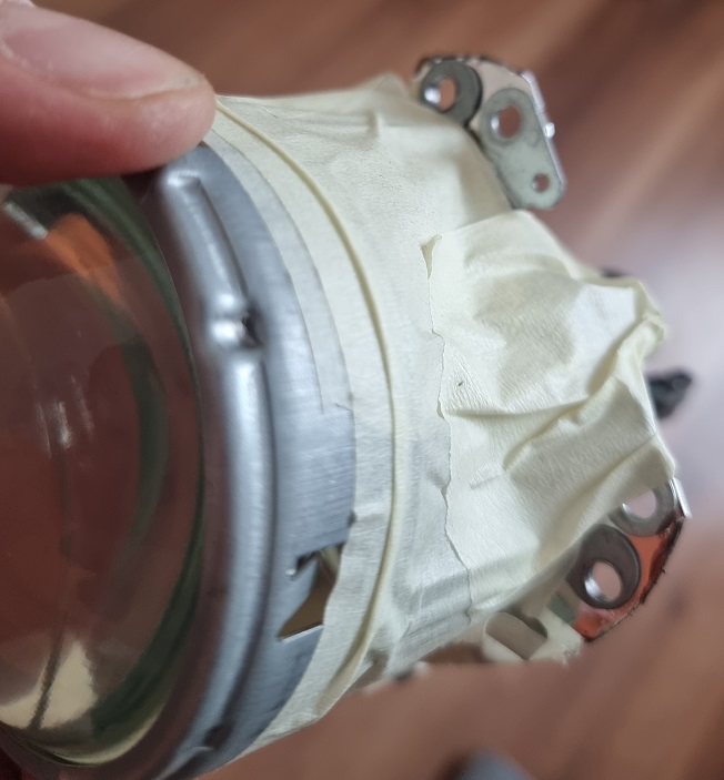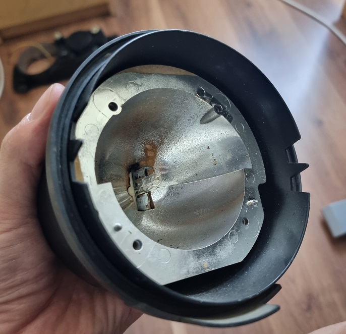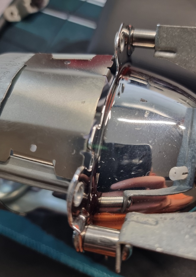 Damit die der Strahler in das Gehäuse passt, müssen die zwei überstehenden Ecken abgeschnitten werden. Hier empfehle ich den Schnitt vor ab mit einem Stift anzuzeichnen und den Winkel wieder zu demontieren. Dadurch hat man mehr Platz beim Schneiden. Weiters würde ich den Strahler abkleben, damit kein Funkenflug nach innen auf den Reflektor kommt. Hier ein Bild wo man die überstehenden "Ohren" gut sieht: