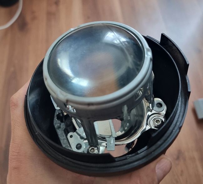 Danach muss der Strahler aus dem Gehäuse geholt werden. Hierzu die zwei Verstellschrauben für den Strahler komplett heraus drehen (gegen den Uhrzeigersinn) bis der Strahler freigängig ist. Ich habe vorher die Linse mit dem Gestänge abgeschraubt, da dadurch mehr Platz und alles besser zu greifen war (die 4 Schrauben lösen).