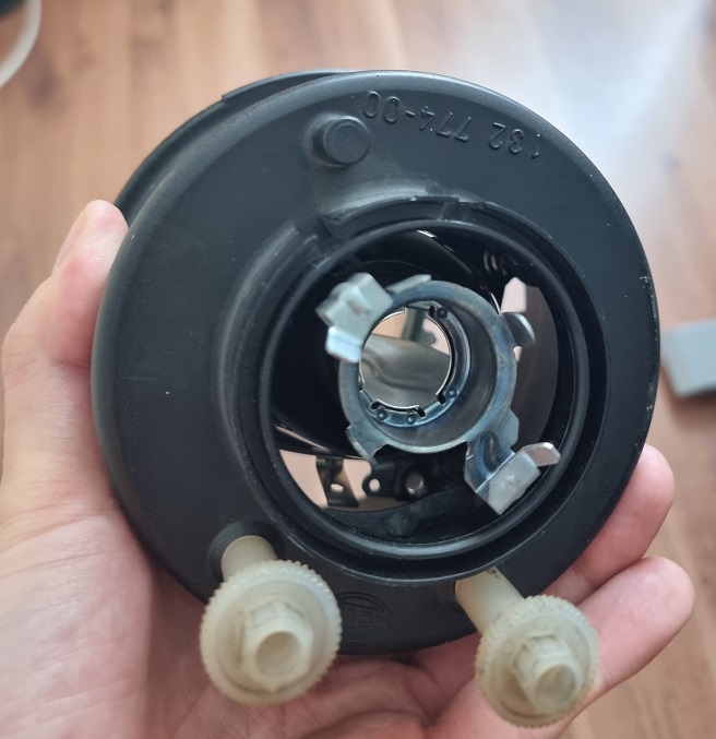 Zu guter Letzt die beiden originaler Steckerkontakte in das Steckergehäuse einführen, hierbei habe ich den Gummischutzschuh einfach nach hinten geschoben, falls er nochmals benötigt wird (siehe Foto). Danach noch die Abdeckung der Steckerkontakte wieder auf das Gehäuse drauf drücken und das silbere Einrastblech montieren. Auf die H7 Birne stecken und in den Strahler montieren: