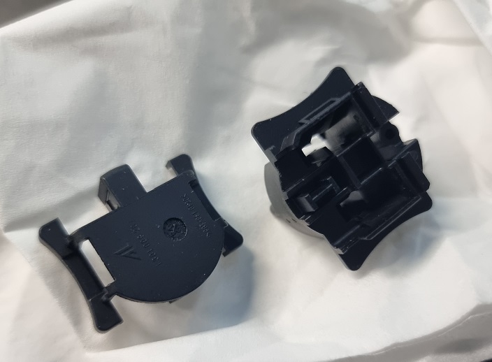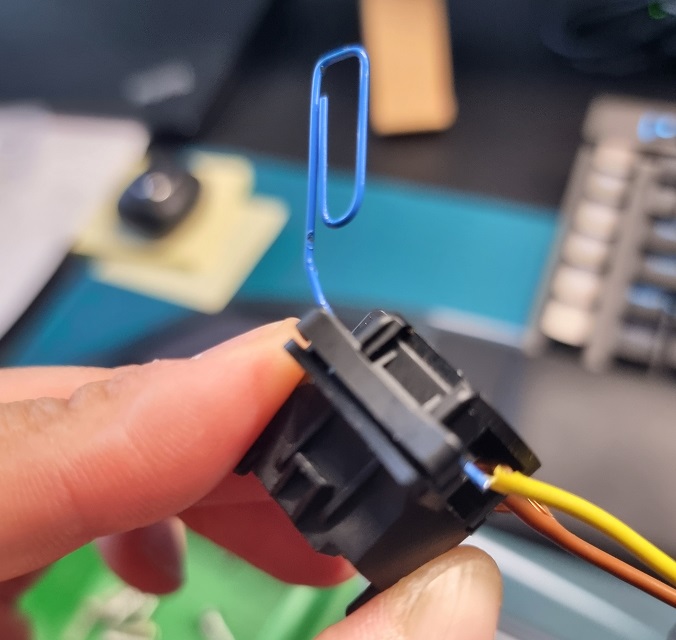 Als vorletzten Schritt benötigen wir nun den Touran Stecker, welchen wir in den Rallye Scheinwerfer montieren müssen. Hierzu die silberen Montageplatte ausbauen in dem man die beiden seitlichen Ohren etwas anhebt und dann diese abzieht. Als nächstes muss man die obere Montageplatte des Steckers abziehen. Hier habe ich mit einer Büroklammer die Halternasen hochgebogen, da diese leicht brechen. Hier ein Bild davon: