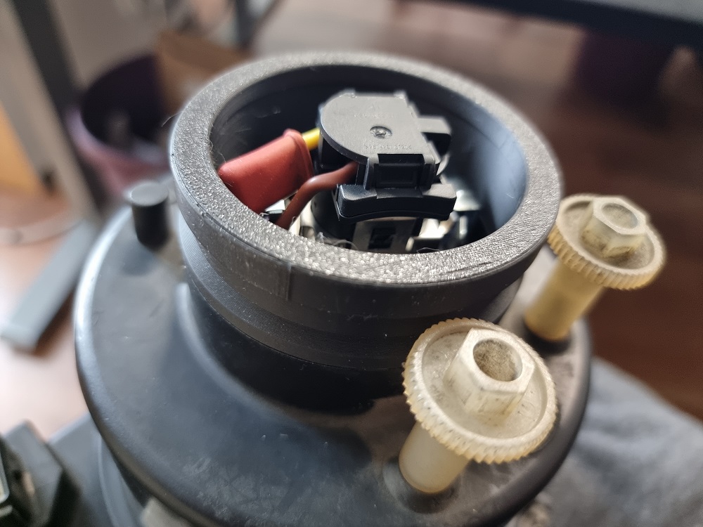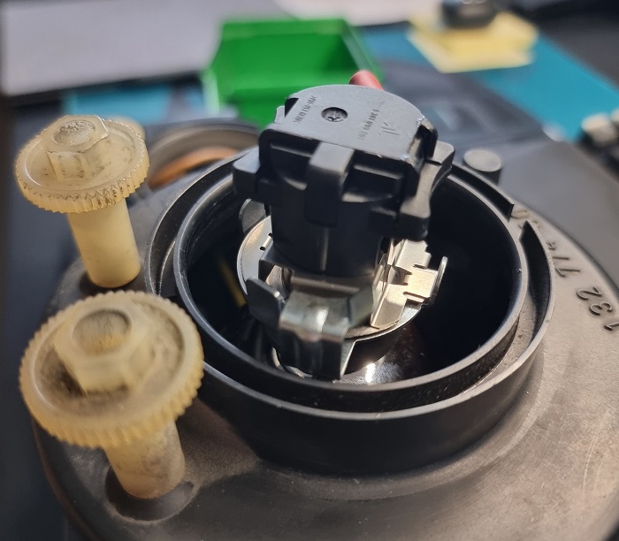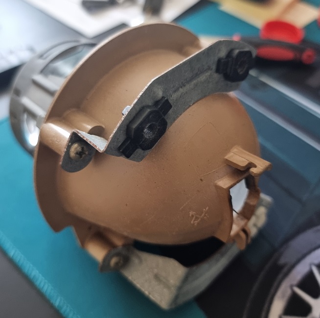 Jetzt muss dieser in das Gehäuse "zurück" montiert werden. Dafür am Besten als erstes den Strahler in das Gehäuse geben und gleich mal die zwei Verstellschrauben wieder ziemlich weit hineindrehen. Nun kommt der knifflige Teil davon. Es muss nun der zweite Winkel die Kugelschraube gedrückt werden. Ich habe hier mit einem längen schmalen Stab gleich neben der weißen Plastikhalterung angesetzt und dort angedrückt. Auch hier ist etwas beherzteres Drücken nötig bis es klack macht. Nun ist der Strahler dort wo er hin gehört: