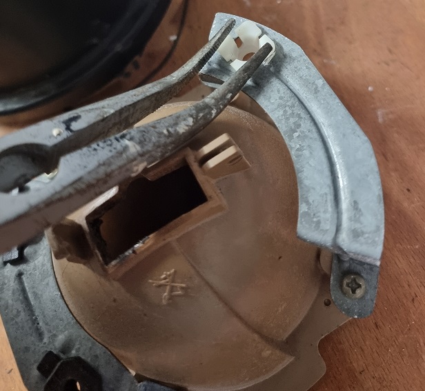 Nun hängt er nur mehr an einer Kugelschraube, von dieser muss er mit einem beherzten Druck, oder im meinem Fall mit einer Spitzzange ausgehebelt werden (war die beste Variante). Hier noch ein Beispielbild wo ich mit der Zange an der Kugelschraube angesetzt und dann herausgehebelt habe.